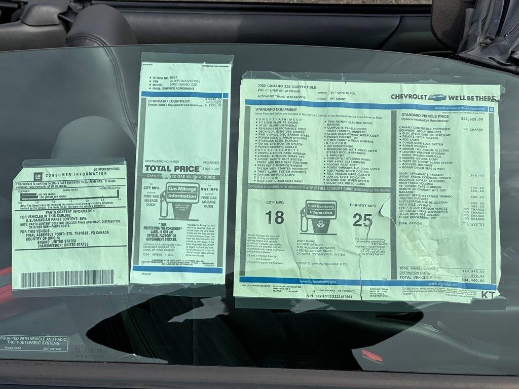 Camaro Z28, 2D Convertible, 5.7L V8 SFI Gen III Aluminum, 4-Speed Automatic with Overdrive, RWD, Onyx Black, Ebony Leather.